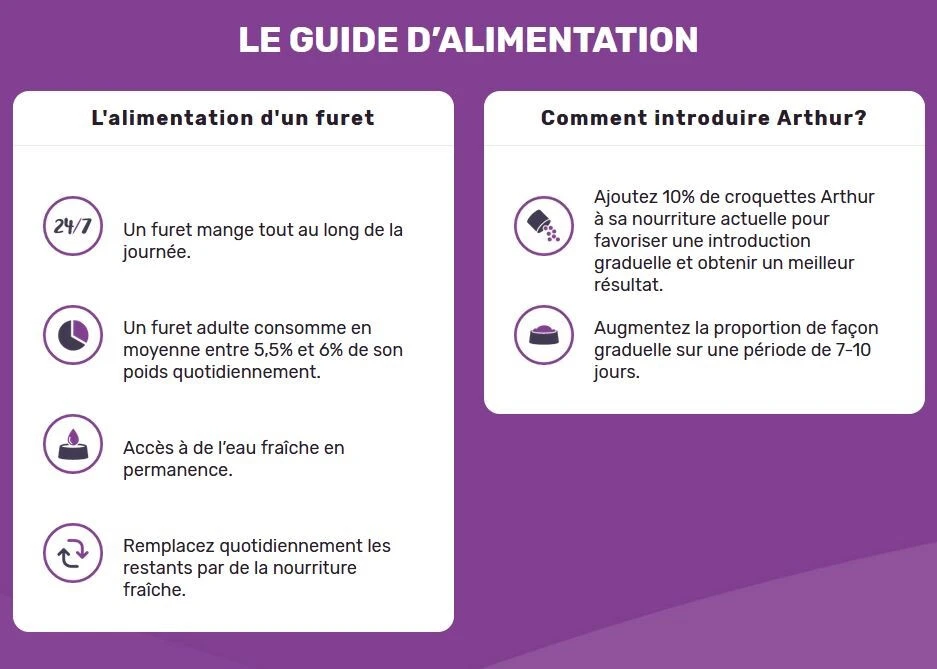 La nourriture pour toutes les étapes de vie pour furet Arthur est complète et balancée et ne contient aucun grain ni pois. Elle est conçue pour nourrir adéquatement les carnivores et son haut taux de protéine animal y veille bien! Elle a également un ajout de taurine qui contribu au maintien de la santé cardiaque et du tonus musculaire. Elle contient des omégas pour maximiser la beauté de la peau et du pelage et minimiser la chute des poils. Arthur pour furet diminue les odeurs de l’urine et des selles grâce à l’ajout de Yucca schidigera. Bref une nutrition santé pour un furet en santé! Fait au Canada.