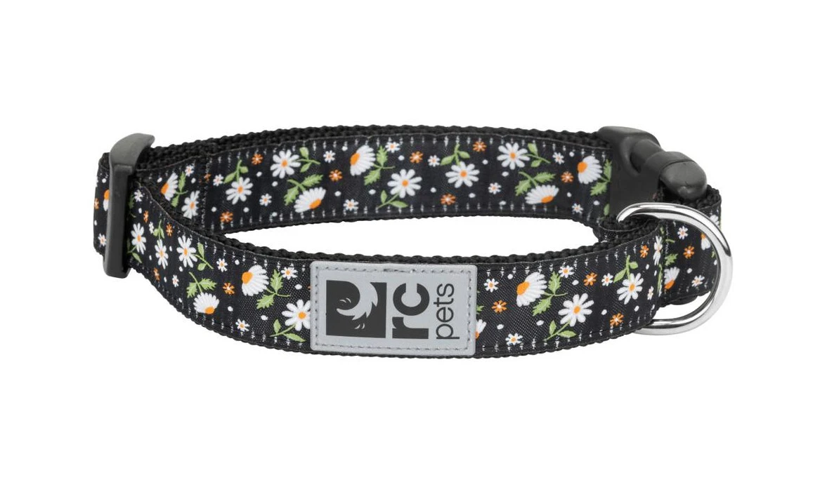 Le collier de nylon avec clip de Rc Pets à motif de marguerite. Un anneau de plastique est à votre disposition pour y ajouter une médaille pour identifier votre animal. Le nylon utilisé est tissé solide pour une bonne durabilité du collier. Le collier fait 1/2 pouce de large et mesure de 8 pouces à 10 pouces. Un logo de Rc Pets Products est cousu sur le collier, celui-ci réfléchit la lumière rendant les promenades nocturnes plus sécuritaire.