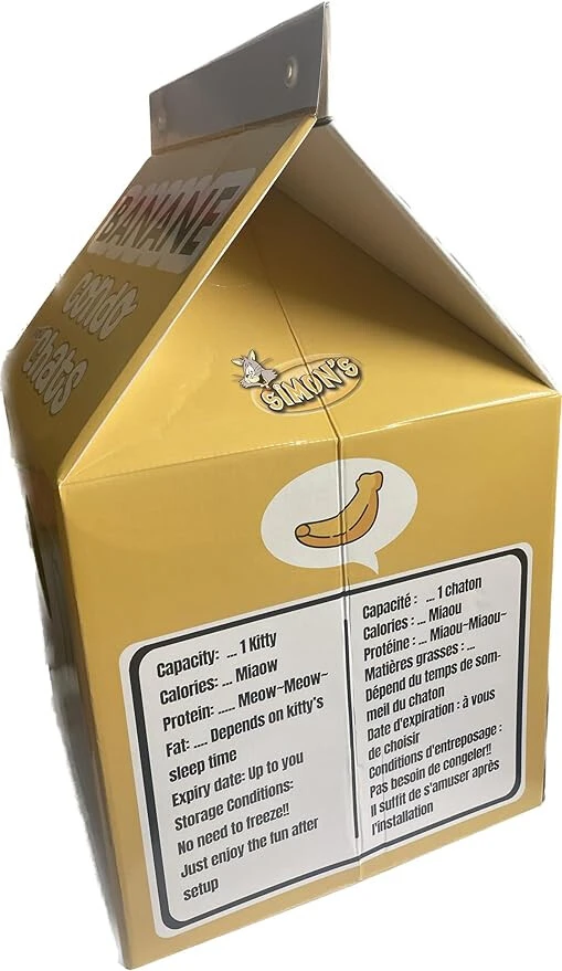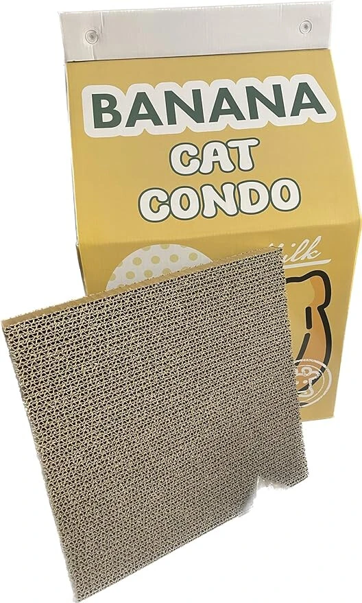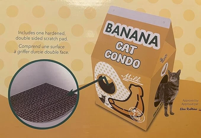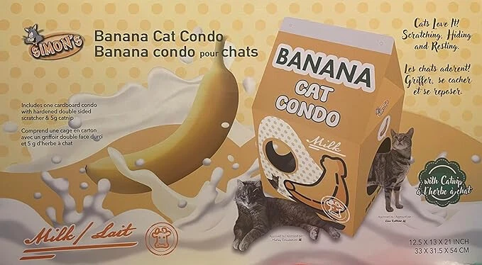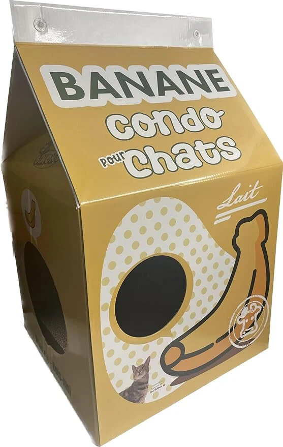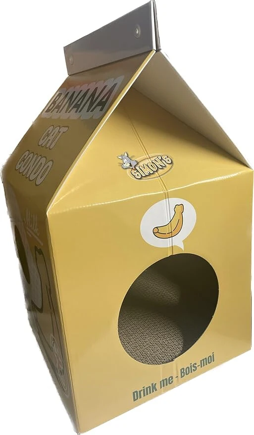 Le condo de lait à la banane pour chats de la compagnie Simon’s saura certainement plaire à votre chat. Il a la grandeur idéale pour servir de cachette à ce dernier lorsqu’il désire se reposer. Le condo de lait à la banane a un griffoir double face durci, ce qui fait en sorte que votre cher ami félin sera en mesure de faire ses griffes à un endroit prévu à cet effet. Il vient aussi avec 5 grammes d’herbe à chat que vous pourrez utiliser pour inciter votre chat à y jouer.