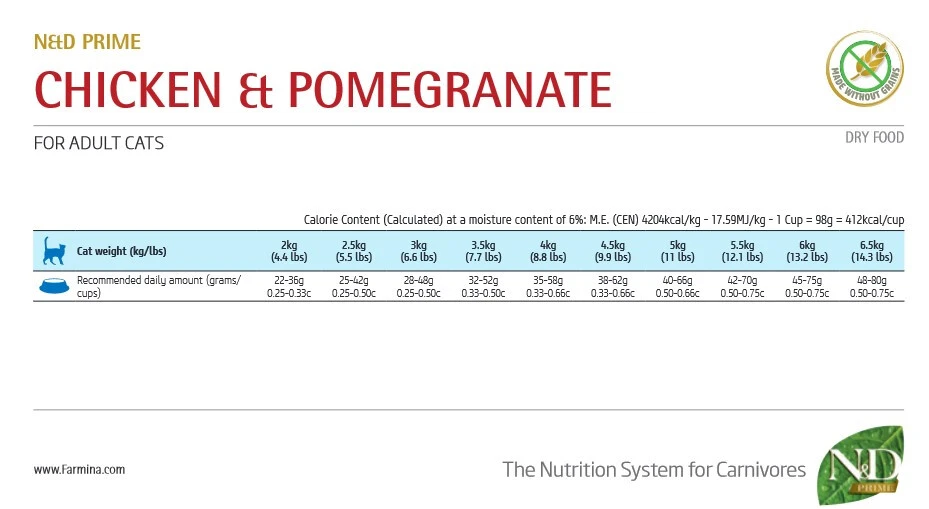La nourriture N&D Prime au Poulet & Grenade pour chats adultes Farmina est composée de poulet frais, de carotte séchée, racine de curcuma et de biens d’autres aliments de qualité. Cette recette, formulée par des vétérinaires en Europe, repose sur plus de 50 ans d’innovation en matière de nutrition animale. Elle ne contient pas de céréales, de sucre, de sous-produits, de colorants, d’OGM ni d’agents de conservation artificiels. Pour assurer la fraicheur et la qualité du produit, de l’azote est introduite dans le sac lors de l’emballage. Cette dernière se substitue à l’oxygène, garantissant une conservation naturelle de la nourriture. Un autre procédé technologique est utilisé pour garantir la valeur nutritionnelle des croquettes. Il s’agit de l’injection à froid des précieux nutriments et de l’enrobage sous-vide, par exemple de la taurine est ajoutée pour s’assurer que le chat reçoit tout ce dont il a besoin. Fait à partir de 98% de protéine animale, elle convient aux vrais carnivores! La nourriture N&D Prime au Poulet & Grenade pour chats adultes est savoureuse et saura plaire aux plus difficiles.
