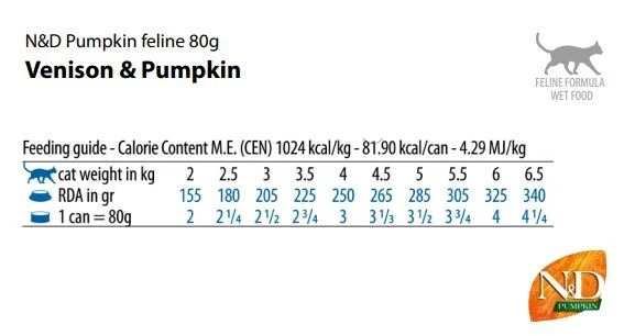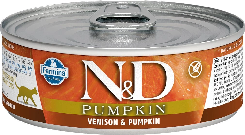 La nourriture en boîte Farmina Potiron au cerf est succulente, naturelle et ne contient aucun grain. Les ingrédients contenus dans les conserves Farmina sont ajoutés crus et cuit à la vapeur une seule fois. Ce procédé unique fait en sorte de préserver les caractéristiques sensorielles et nutritionnelles pour votre chat. Cette recette, formulée par des vétérinaires en Europe, repose sur plus de 50 ans d’innovation en matière de nutrition animale. Elle ne contient pas de céréales, de sucre, de sous-produits, de colorants, d’OGM ni d’agents de conservation artificiels. Il s’agit d’un repas complet et balancé qui est sous forme de morceaux dans un bouillon que les chats adorent tant.