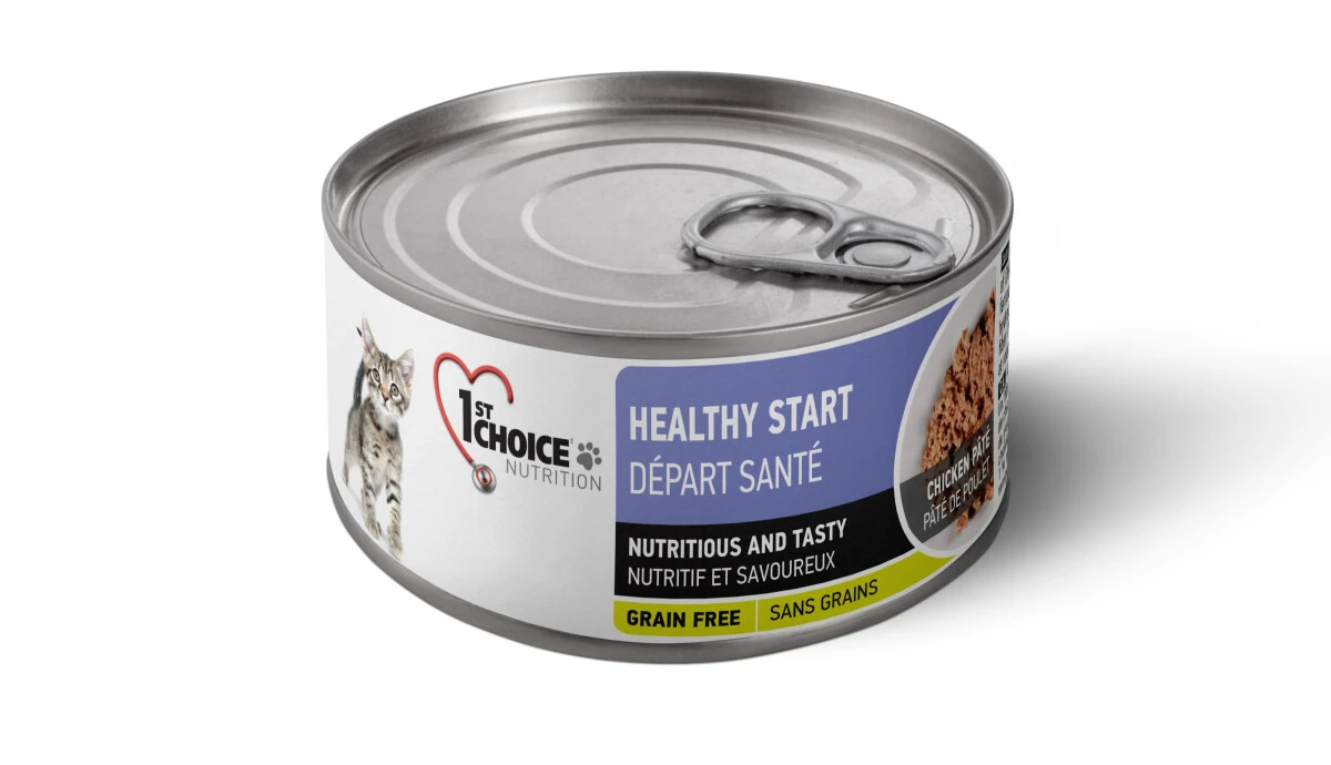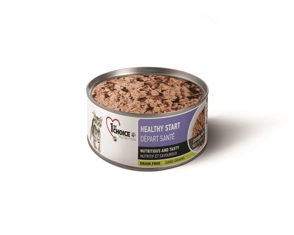 La nourriture en boîte pâté de poulet sans grains pour chatons de la compagnie 1st Choice est conçue pour les chats de 2 à 12 mois de toute race. Elle est faite de poulet, de foie de porc et de saumon. De plus, elle ne contient aucun grain. Sa texture ainsi que son goût savoureux sauront plaire à votre chat. Que ce soit pour donner comme alimentation de base, pour mélanger à la croquette ou bien pour récompenser votre chat, la nourriture en conserve pâté de poulet de 1st Choice est une alternative délicieuse.