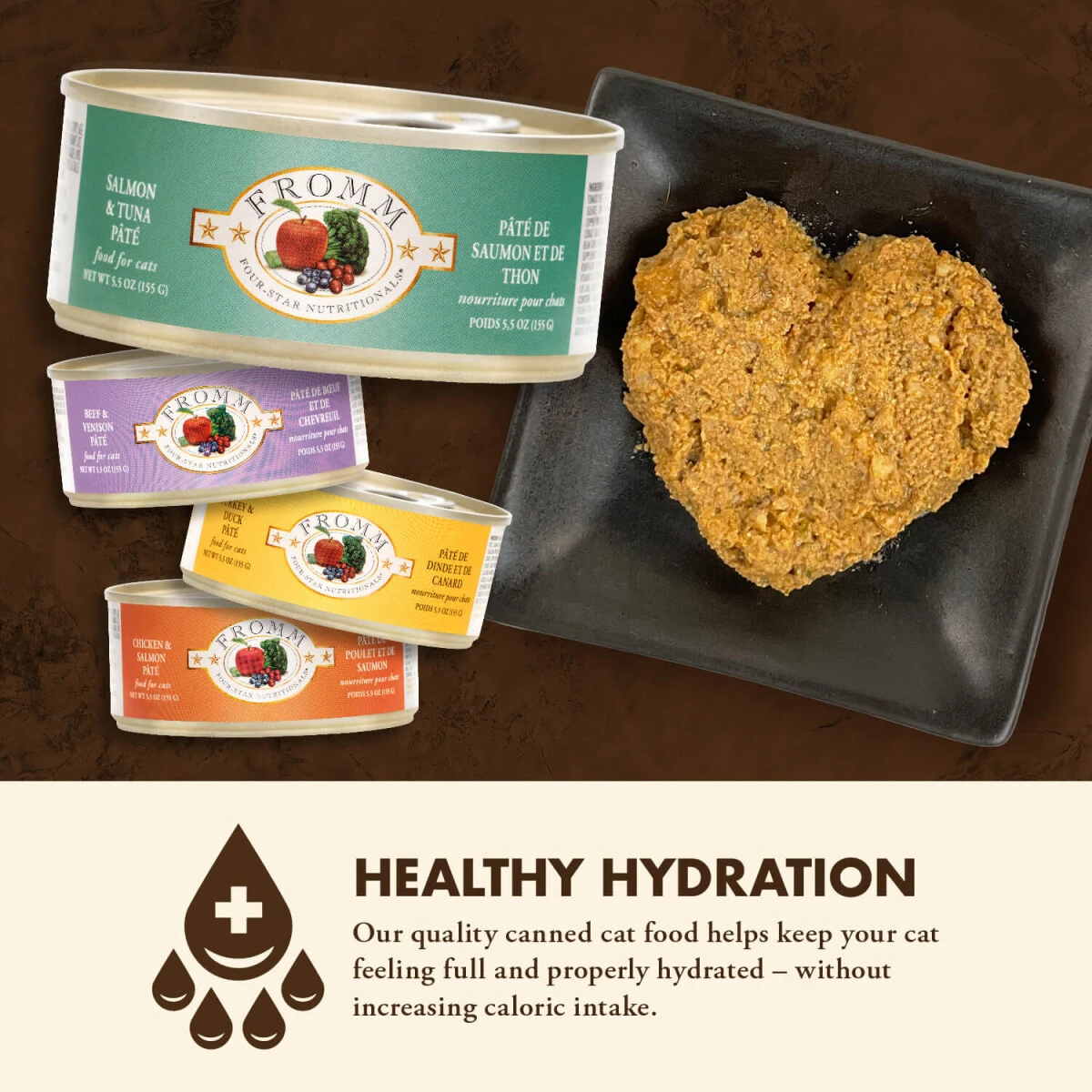 Riche en antioxydant et en minéraux chélatés, la nourriture en boîte Fromm Four-Star pâté de saumon et de thon pour chats apportent tous les éléments nutritifs d’une nourriture complète de haute qualité. Elle peut être donnée à un chaton autant qu’à un chat vieillissant et est très performante au niveau de la peau et du pelage. La nourriture en boîte Fromm Four-Star pâté de saumon et de thon est recommandée pour les chats diabétiques ou bien qui ont un cancer grâce à son indice glycémique qui est très bas. Voyez la différence Fromm votre chat vous en remerciera!
