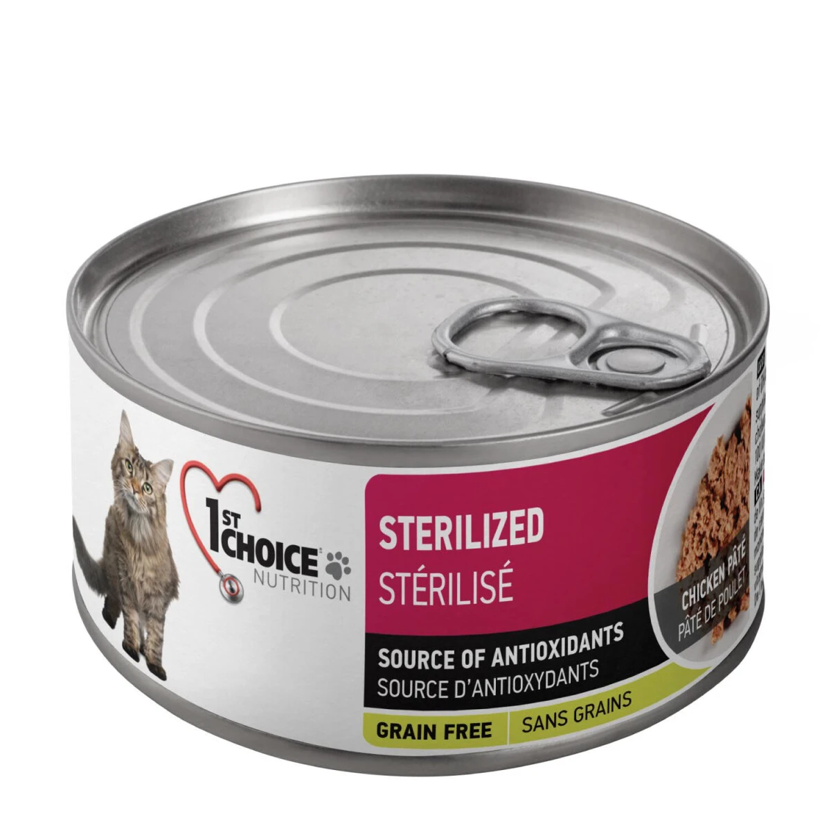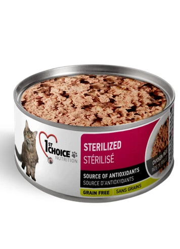 La nourriture en boîte pâté de poulet sans grains pour chats stérilisés de la compagnie 1st Choice est conçue pour les chats adultes de toute race. Elle est faite de poulet, d’œuf entiers et de saumon rose. De plus, elle ne contient aucun grain. Elle est aussi une excellente source d’antioxydants, ce qui fait en sorte qu’elle contribue au bon maintien du système immunitaire de votre animal. Sa texture ainsi que son goût savoureux sauront plaire à votre chat. Que ce soit pour donner comme alimentation de base, pour mélanger à la croquette ou bien pour récompenser votre chat, la nourriture en conserve pâté de poulet de 1st Choice est une alternative délicieuse.