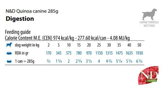 La nourriture en boîte digestion N&D Quinoa à l’agneau pour chiens Farmina est une recette complète qui aide à régler les problèmes de digestion ou éviter qu’ils ne reviennent. Cette recette, formulée par des vétérinaires en Europe, repose sur plus de 50 ans d’innovation en matière de nutrition animale. Elle ne contient pas de céréales, de sucre, de sous-produits, de colorants, d’OGM, ni d’agents de conservation artificiels. Un autre procédé technologique est utilisé pour garantir la valeur nutritionnelle de la nourriture en boîte, est la cuisson à même la conserve. En d’autres mots, les ingrédients sont insérés crus dans la conserve pour ensuite être sellés et cuits. Ainsi, tous les nutriments restent dans la boîte.