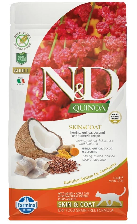 La nourriture N&D Quinoa Peau et Pelage pour chats de Farmina est composée d’hareng frais, de quinoa, de noix de coco et de curcuma. C’est une recette complète qui contient un nombre limité d’ingrédients et qui réduit les intolérances alimentaires. Cette recette, formulée par des vétérinaires en Europe, repose sur plus de 50 ans d’innovation en matière de nutrition animale. Elle ne contient pas de céréales, de sucre, de sous-produits, de colorants, d’OGM ni d’agents de conservation artificiels. Pour assurer la fraicheur et la qualité du produit, de l’azote est introduite dans le sac lors de l’emballage. Cette dernière se substitue à l’oxygène, garantissant une conservation naturelle de la nourriture. Un autre procédé technologique est utilisé pour garantir la valeur nutritionnelle des croquettes. Il s’agit de l’injection à froid des précieux nutriments et de l’enrobage sous-vide, par exemple de la taurine est ajoutée pour s’assurer que le chat reçoit tout ce dont il a besoin.