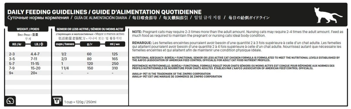La nourriture pour chats Functional Chat Sénior et Moins Actif de la compagnie Boréal est sans grains et est conçue pour résoudre ou prévenir des problèmes spécifiques. Savoureuse, elle aide à réduire de tartre, les boules de poils et garde les voies urinaires en santé. Elle contient également de la viande fraîche comme premier ingrédient. Elle répond également aux besoins alimentaires des chats adultes et âgés. Ce qui démarque Boréal des autres compagnies est l’ajout du mélange Availa® Pet qui est composé de minéraux et de zinc qui maximise la digestion et l’absorption des nutriments. La nourriture pour chats Functional Chat Sénior et Moins Actif est faite au Canada avec des produits locaux.