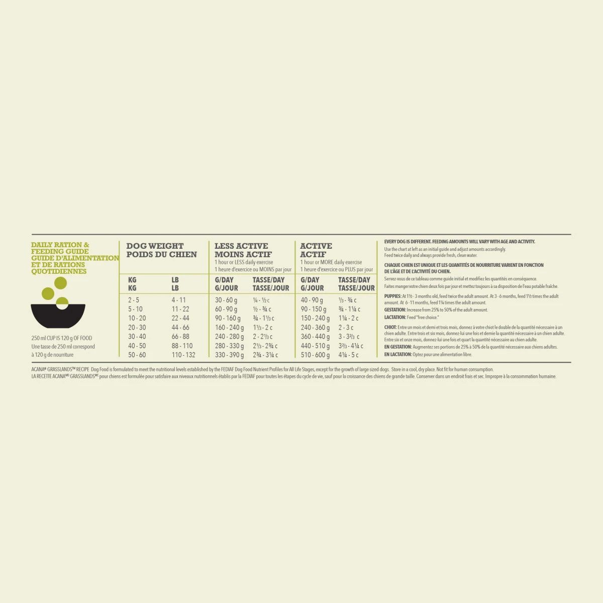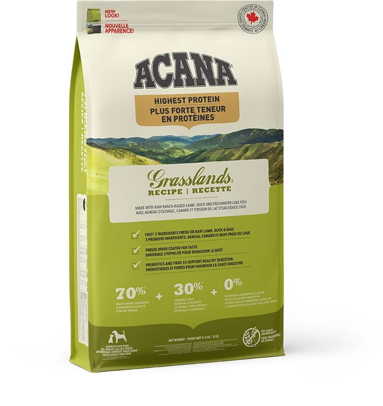 La nourriture pour chiens ACANA plus forte teneur en protéines grasslands est composée d’une grande variété de viande comme de l’agneau et du canard élevé en liberté et une belle variété de poisson frais ou cru. Toute cette belle diversification de protéine rehausse la saveur de la nourriture ACANA plus forte teneur en protéines grasslands et apporte des nutriments variés et complets aux chiens. Cette nourriture sans grains est fortement recommandée pour les chiens actifs, de travail ou qui vivent à l’extérieur. Produit canadien.