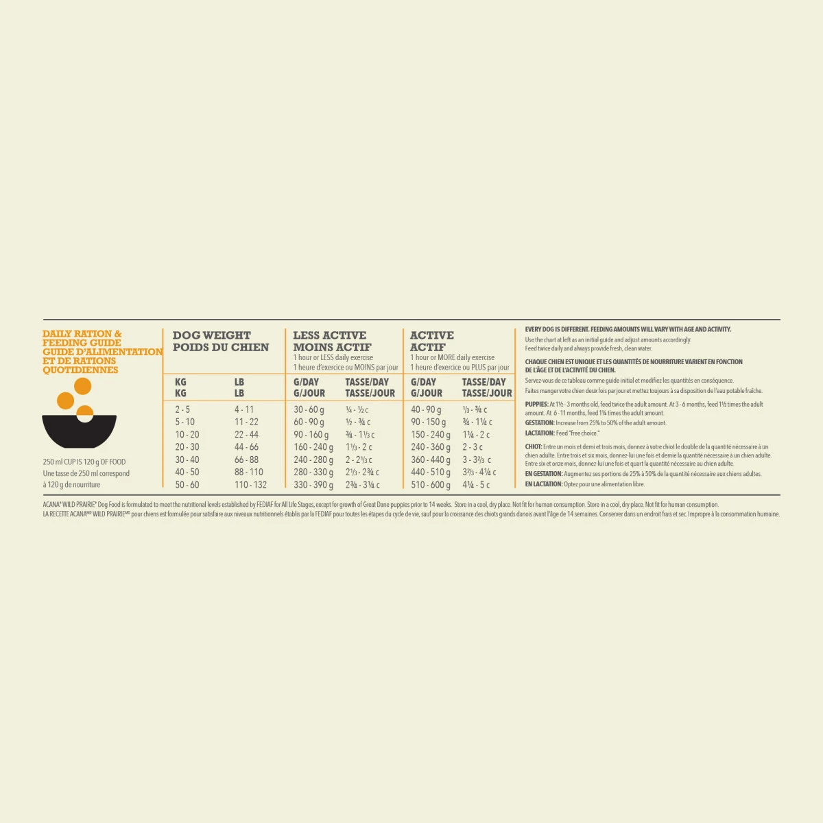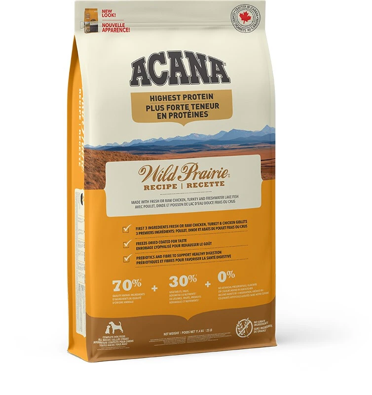 ACANA plus forte teneur en protéines wild prairie pour chiens est une alimentation sans grains qui convient à tous les stades de vie d’un animal. Riche en protéine, elle est composée de poulet élevé en liberté et d’ingrédients régionaux frais ou crus. Cette nourriture faible en glucide contribue à la gestion du poids et au développement de la masse musculaire des chiens. ACANA plus forte teneur en protéines wild prairie est un produit canadien parfaitement adapté pour les chiens qui ont un rythme de vie mouvementé.