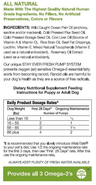 Les Huiles Oméga-3 de WellyTails proviennent des poissons sauvages (sardines, anchois et/ou maquereau). Fait avec les meilleurs ingrédients de grade Humain, sans agents de conservation artificiel, sans saveur artificielle et sans couleur artificiel. Comme tout produit WellyTails, les Huiles Oméga-3 de WellyTails sont de qualité. Grâce à leur pompe spéciale l’oxygène ne peut pas rentrer dans la pompe, ce qui évite aux huiles de devenir rance.